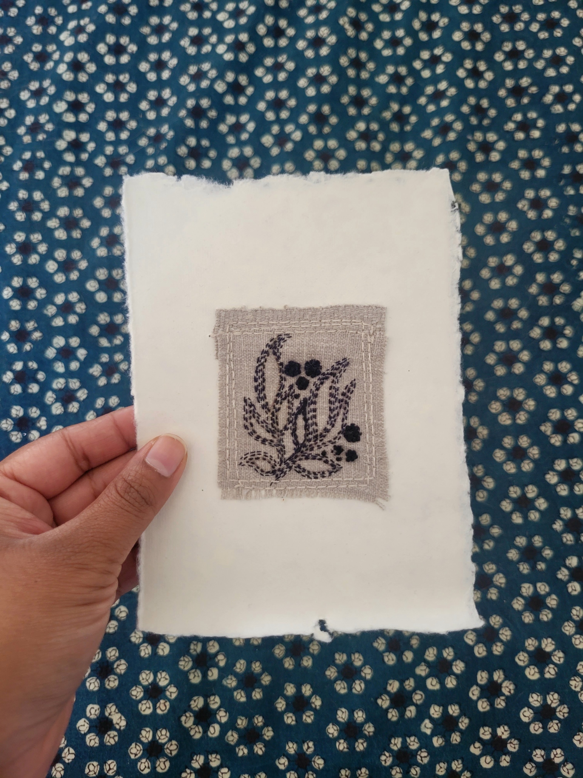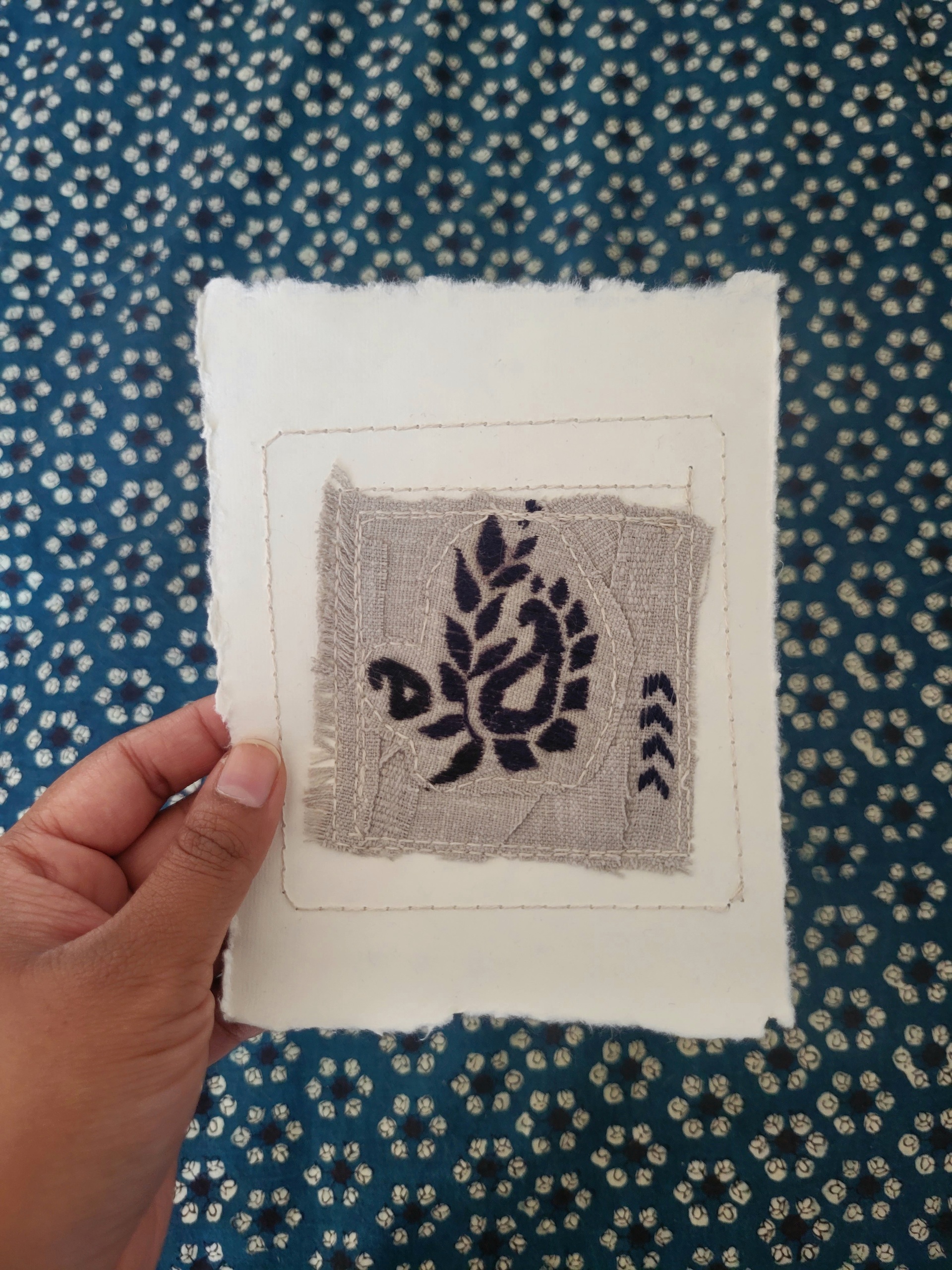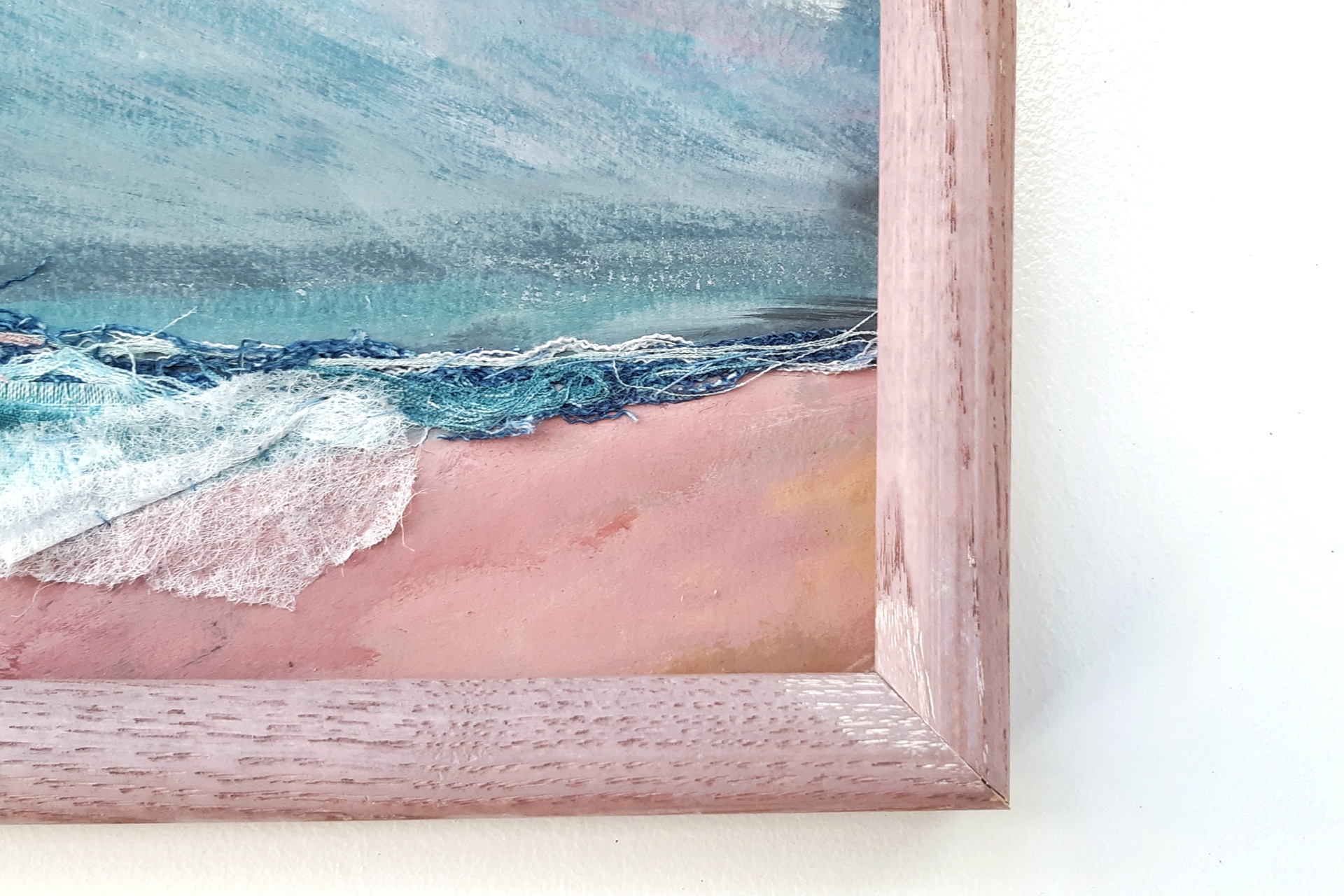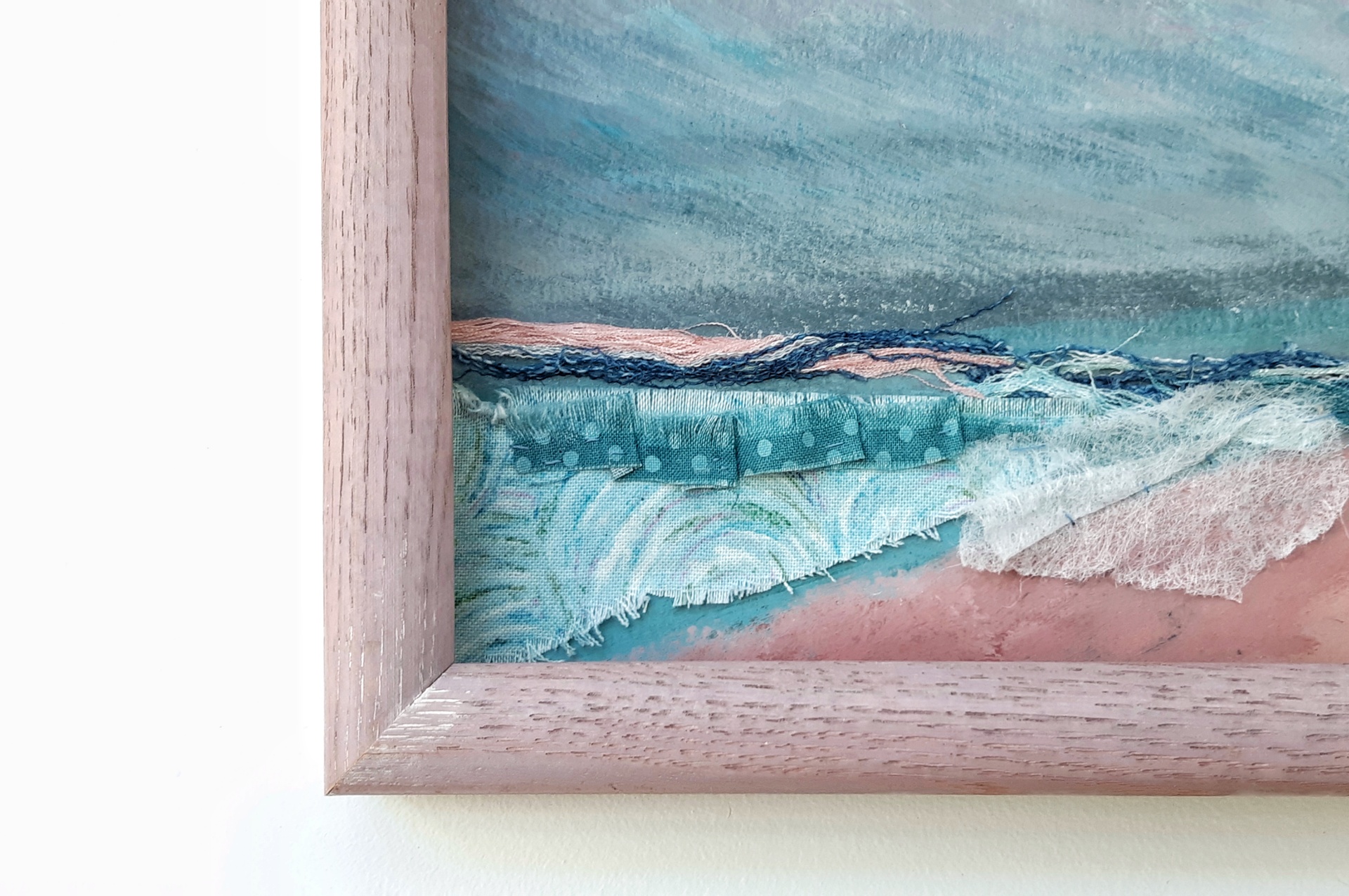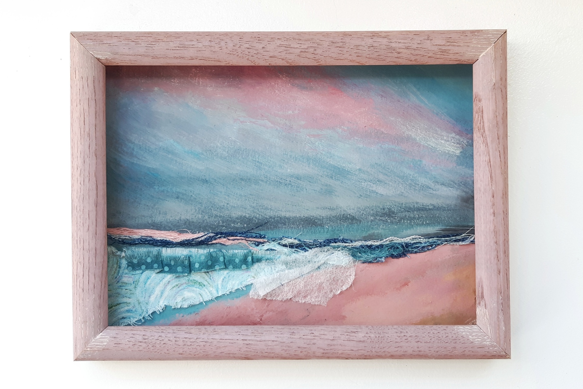 gouache, mixed fabrics, dryer sheet on watercolor paper, stained vintage wooden frame (sold)